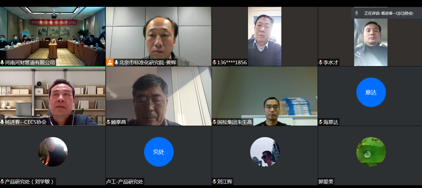 2021年1月15日,由河南河財(cái)管道有限公司、河南省城鎮(zhèn)綜合設(shè)計(jì)研究院主編,中國(guó)建材檢驗(yàn)認(rèn)證集團(tuán)股份有限公司、泰宏建設(shè)發(fā)展有限公司、河南省產(chǎn)品質(zhì)量監(jiān)督檢驗(yàn)院、中電建十一局工程有限公司、浙江中財(cái)管道科技股份有限公司等單位參編的CECS標(biāo)準(zhǔn)《橋梁用雨水管道安裝及驗(yàn)收規(guī)程》標(biāo)準(zhǔn)制定啟動(dòng)會(huì)暨第一次工作會(huì)議以線上視頻會(huì)議和線下現(xiàn)場(chǎng)會(huì)議相結(jié)合的形式召開,線下會(huì)議由河南河財(cái)管道有限公司在鄭州召集。